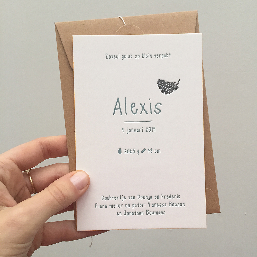Lief geboortekaartje voor Finn gedrukt met letterpress (reliëf) op 600 grams 100% katoen papier. Lief en stoer tegelijk met het handgeschreven font en het kleine parelhoen veertje. De okergele kleur op de snede is optioneel maar maakt dit kaartje helemaal af. Zowel de inktkleur als de kleur op de zijkant zijn in vele kleuren mogelijk. Graag een proefkaartje ontvangen? Leuk! Laat het mij dan even weten.
