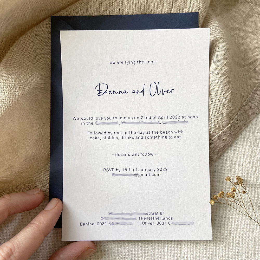 Deze tekening is met de hand opgezet aan de hand van persoonlijke foto’s. Om een persoonlijke tekening van jullie als liefdes koppel of familie te kunnen maken heb ik 1 (of meerdere) foto’s nodig waar jullie geheel opstaan. Ik bepaal dan zelf met jullie de positie en verdeling. De kleren kan ik aanpassen naar wens. Dit ontwerp is te realiseren in letterpress (reliëf) op dik 600 grams papier of met digitale druk op 300 of 600 grams (cacheren/duplex) papier. Leuk om de tekening (en eventuele bijkaart) mooi met de gekozen kleur envelop te laten matchen.